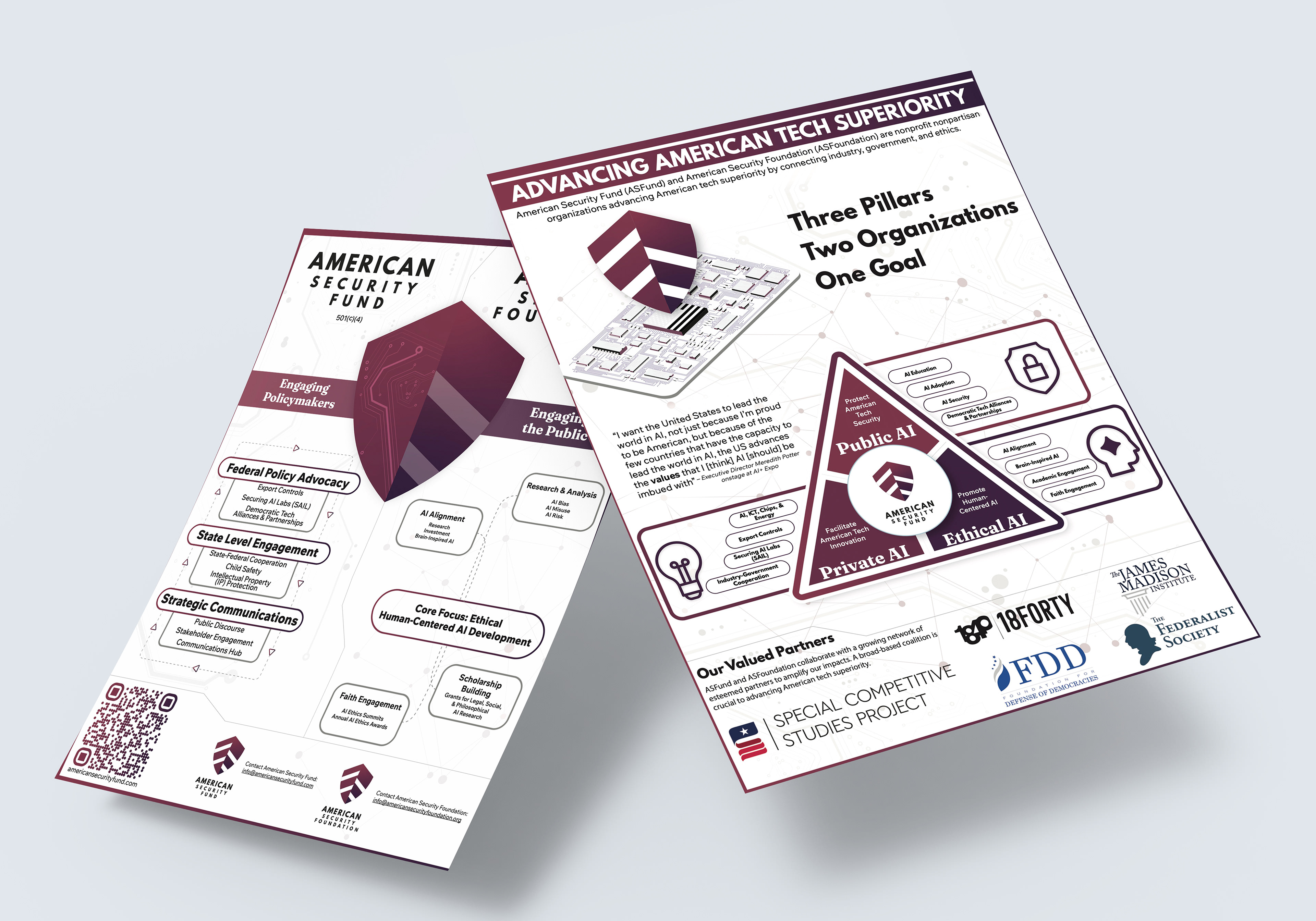 The American Security Fund approached me looking for a way to make their complex mission understandable and engaging. As a non-profit dedicated to securing U.S. technological superiority, my goal was to translate their key areas—technological innovation, national security, and human-centered AI—into clear visual assets that could be used to connect with stakeholders and support their fundraising.